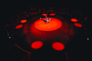 Wichtig war mir bei dem Foto oben einmal die Schönheit der zusammenwirkenden Lichtformen zu zeigen in deren Spot sich die Artisten befinden und zum anderen durch die kleine Brennweite das Größenverhältnis von Zirkus-Manege und Artisten nochmal zusätzlich hervorgehoben. Das Auge fokusiert durch die Symertrie von alleine auf die winzigen Artisten in der Mitte.
