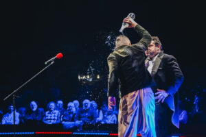 Den richtigen Moment zu erwischen ist für das zweite Foto ganz entscheident. Ich wollte die entsetzten Gesichter der Männer und die fallende Frau mit ihren wehenden Haaren kurz darunter in Szene setzen. Dazu habe ich auf Serienbildmodus bei der Kamera geschaltet. Du hast ja nur einen Versuch während der Vorstellung.